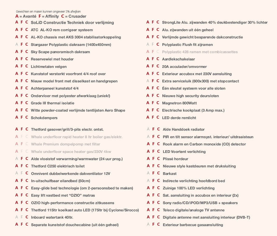 Het interieur is uitgevoerd in een nieuwe lichte houtkleur, een lang dakraam, softclose laden en kastdeuren, dakventilator. Alde verwarming met design badkamer radiator, keukenwand afwerking in acrylaat. Werkelijk alles straalt luxe uit. De buitenzijde kenmerkt zich door een unieke beige metallic kleur met nieuwe graphics. De Crusader wordt geleverd in 245 cm breedte. Crusader serie echt onderscheidend in het topsegment.